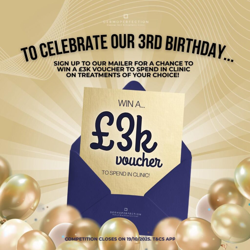 To celebrate our 3rd Birthday…. Sign up to our mailer for a chance to win a £3K voucher to spend in clinic on treatments of your choice!